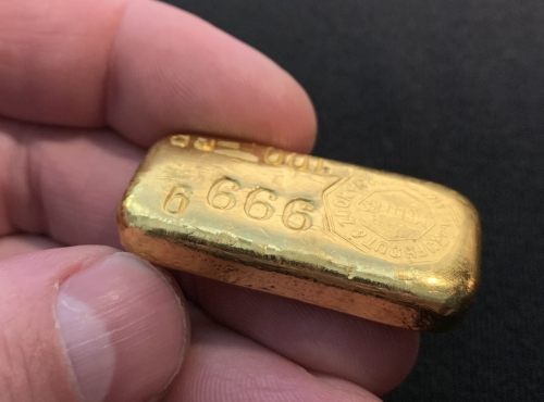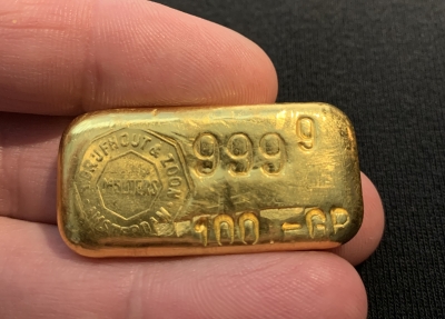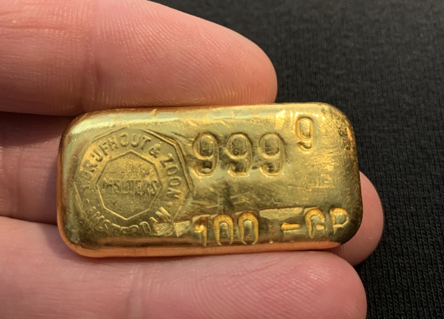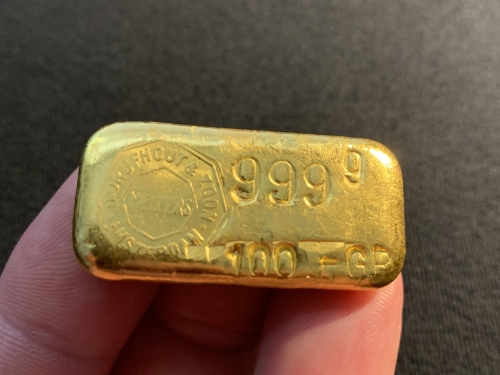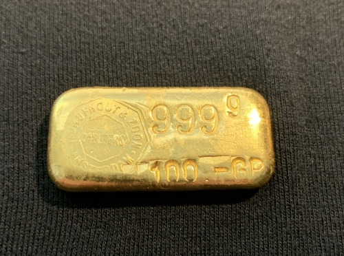 This bar weighs 100 grams and is stamped 999.9 fine.