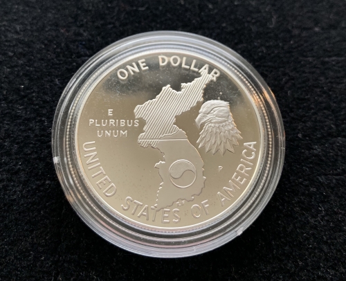 USAF F-86 fighter jets, renowned for their air superiority, streak across the sky as a soldier climbs a hill and naval ships float in the water – all captured on the obverse of this action-packed silver dollar. Struck to honor Korean War veterans, this 90% silver coin marked the 38th anniversary of the war's end. Thirty–eight is an important number – the war lasted 38 months, and the 38th parallel is the demilitarized zone.