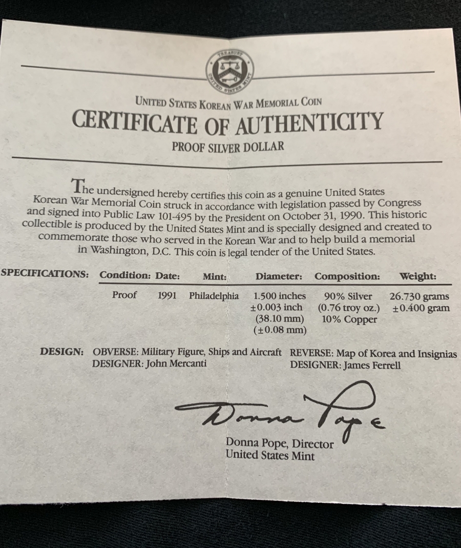 1991 Korean War Proof Silver Memorial Coin