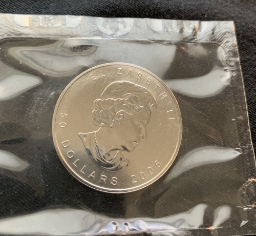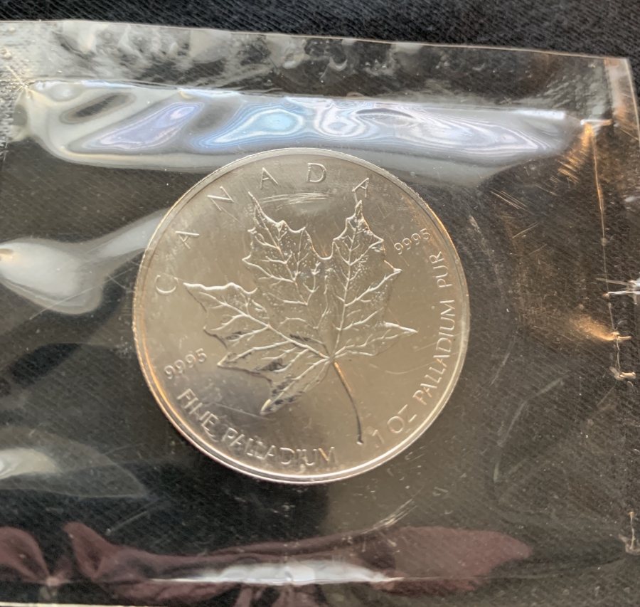 A 2006 $50 Canada Maple Palladium coin.This coin weighs 1 ounce and is stamped 9995 fine by the Canadian Mint.
